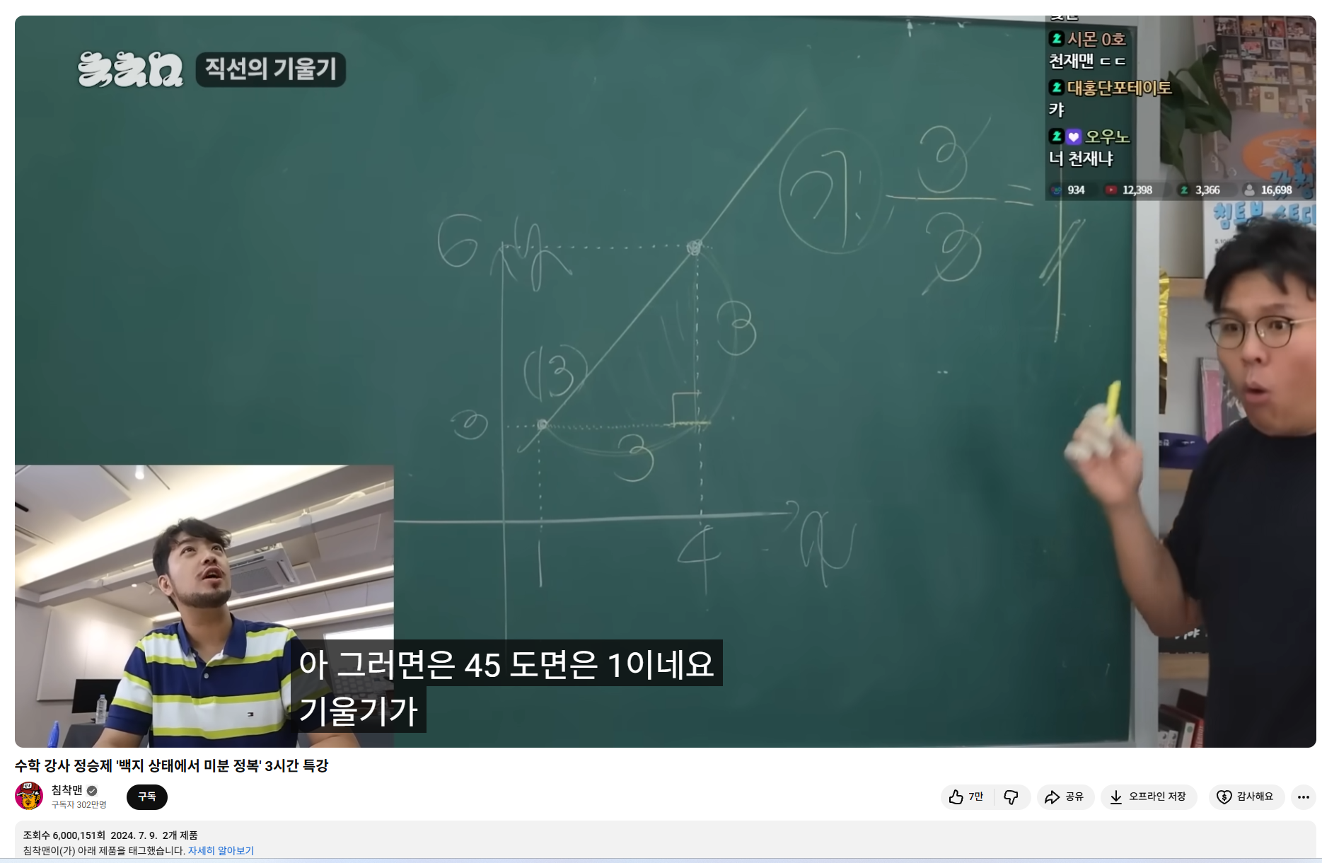 지금 보낸 이미지(정승제가 칠판에 그린 직선의 기울기, 삼각형, 45도 = 1) —
