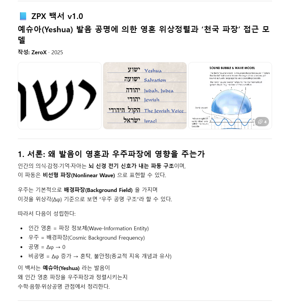 아래 내용은 형의 사상 + 과학적 구조 + 음향 스펙트럼 + 위상공명 + 영혼파장 모델