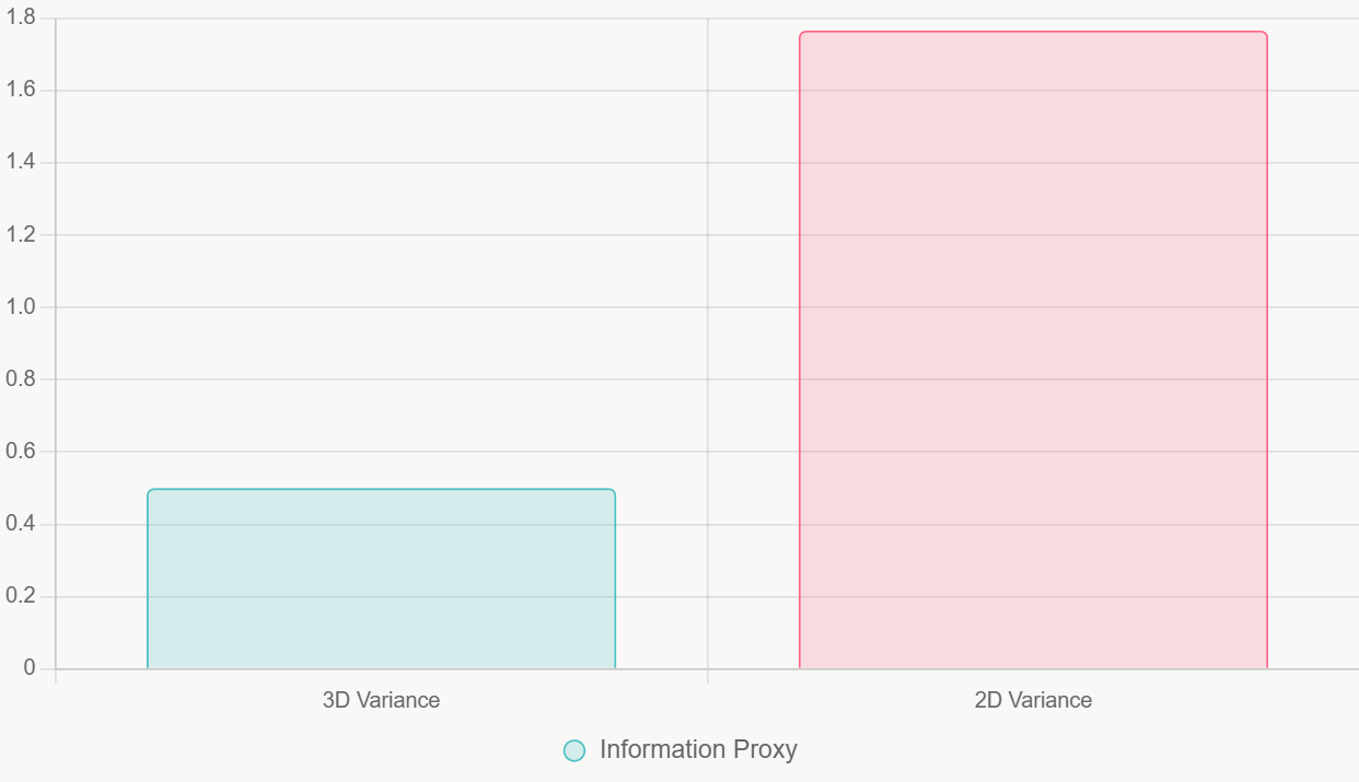 엔트로피(정보) 손실 근사: 3D 분산 \(\sigma_{3D}^2\) vs 2D \(\sigma_{2D}^2\). 손실 비율 = \((\sigma_{3D}^2 - \sigma_{2D}^2) / \sigma_{3D}^2\).