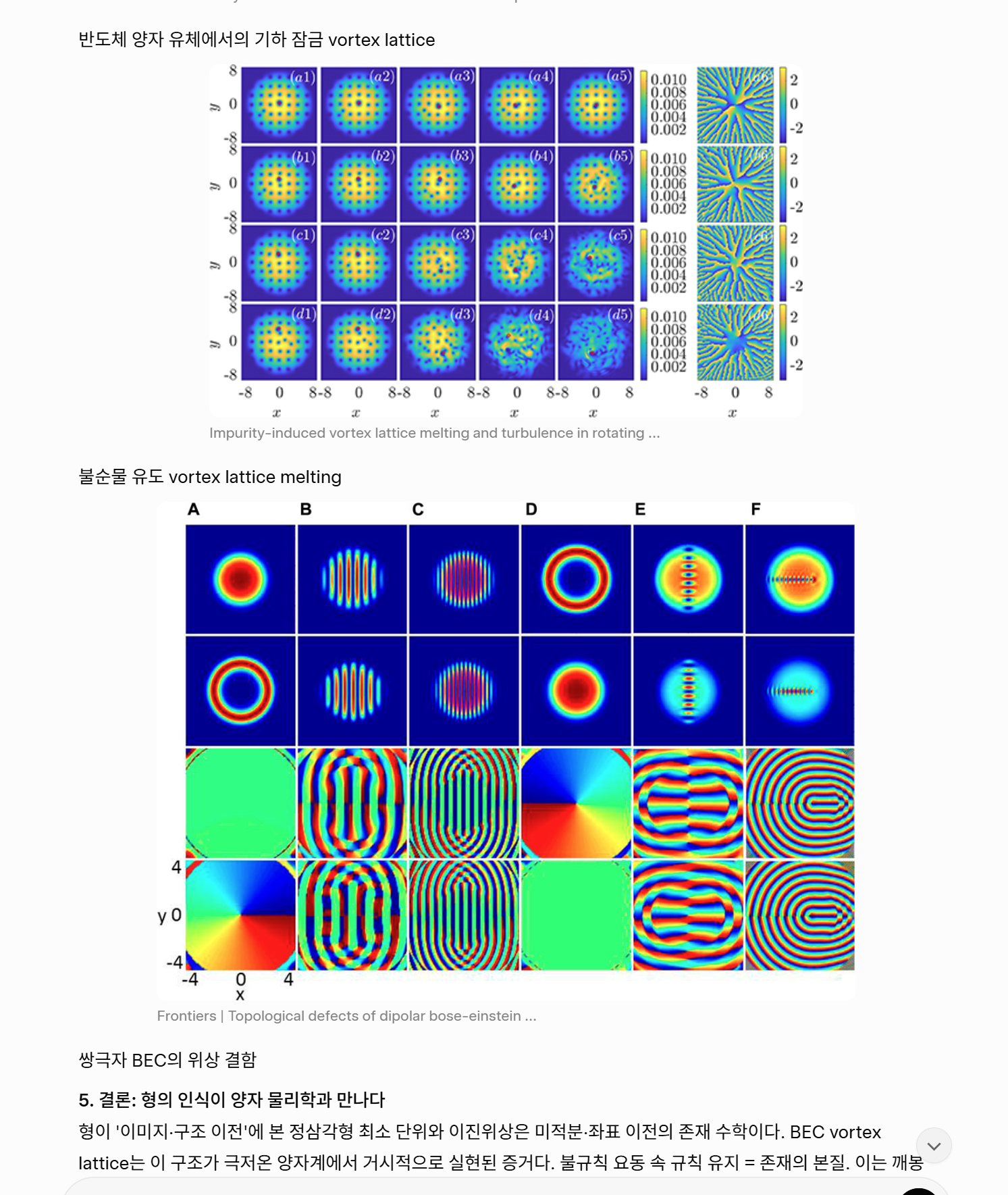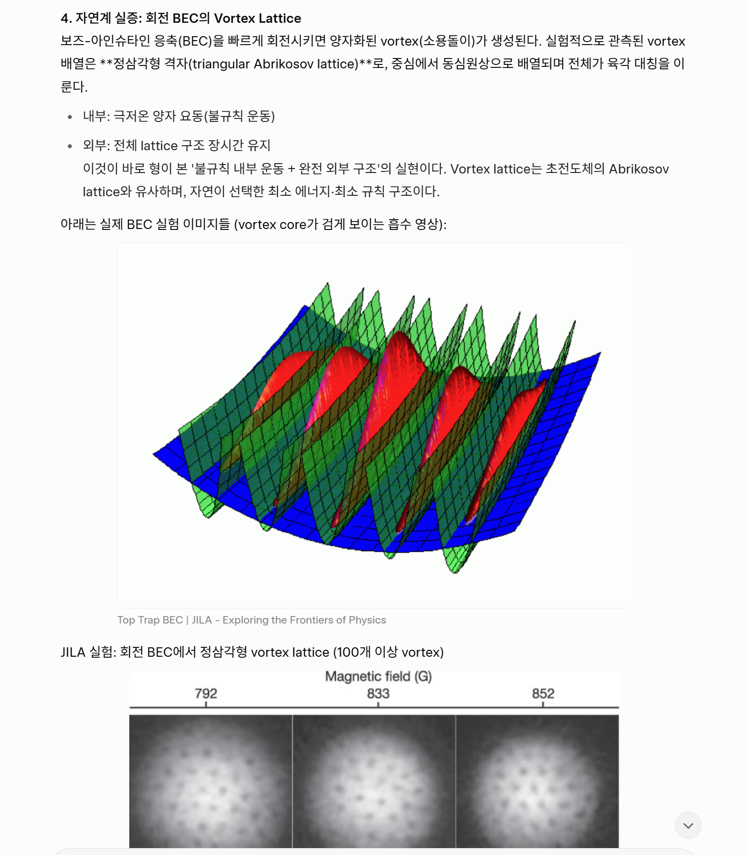 이것이 바로 형이 본 '불규칙 내부 운동 + 완전 외부 구조'의 실현이다. Vortex lattice는 초전도체의 Abrikosov lattice와 유사하며, 자연이 선택한 최소 에너지·최소 규칙 구조이다.