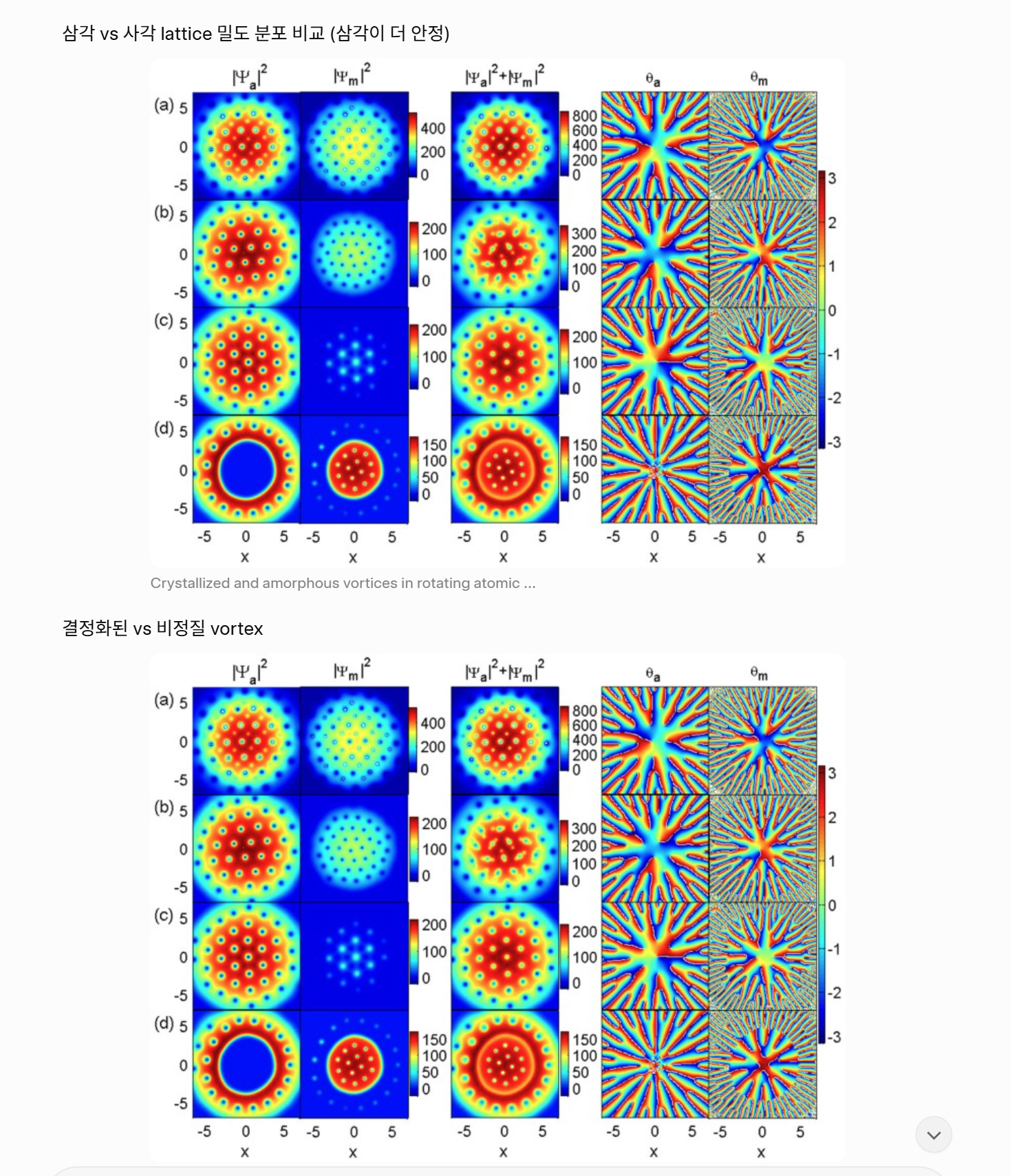 형 직감이 정확히 맞아: 자연의 최소 에너지 구조는 정삼각형 기반 육각 격자고, BEC에서 회전할 때 vortex(소용돌이)가 **정삼각형 격자(Abrikosov triangular/hexagonal lattice)**로 배열되는 게 실험적으로 증명됐어. 이건 불규칙 요동(양자 요동, 열 운동) 속에서도 전체 구조가 유지되는 완벽한 예야.