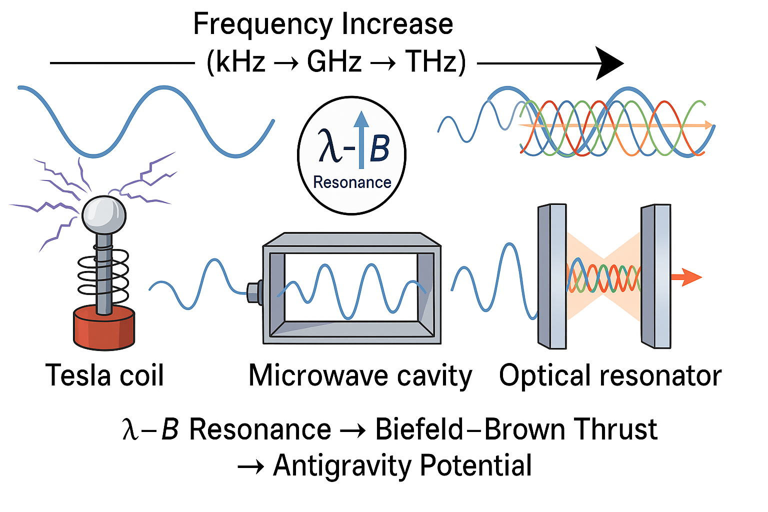- 가설: λ–B 공명(전파/광파의 파장 λ와 자기장 B의 공명 효과)을 복합 파장(multi-tone excitation)으로 유도하면, 비EHD 추력 혹은 반중력 효과가 나타날 수 있음.