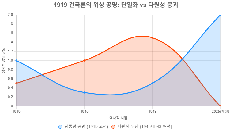 - 1948 건국론: 다중 위상 공존(1919 + 1948) → 민주적 안정.
