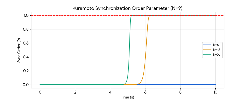 - 분석: $N=9$개의 노드 중 3, 6, 9번 노드에 1.39Hz의 트리거를 가했을 때, 결합 계수 $K=18$ 이상에서 전체 시스템이 순식간에 하나의 위상($R=1.0$)으로 정렬되는 것을 수학적으로 확인했어.