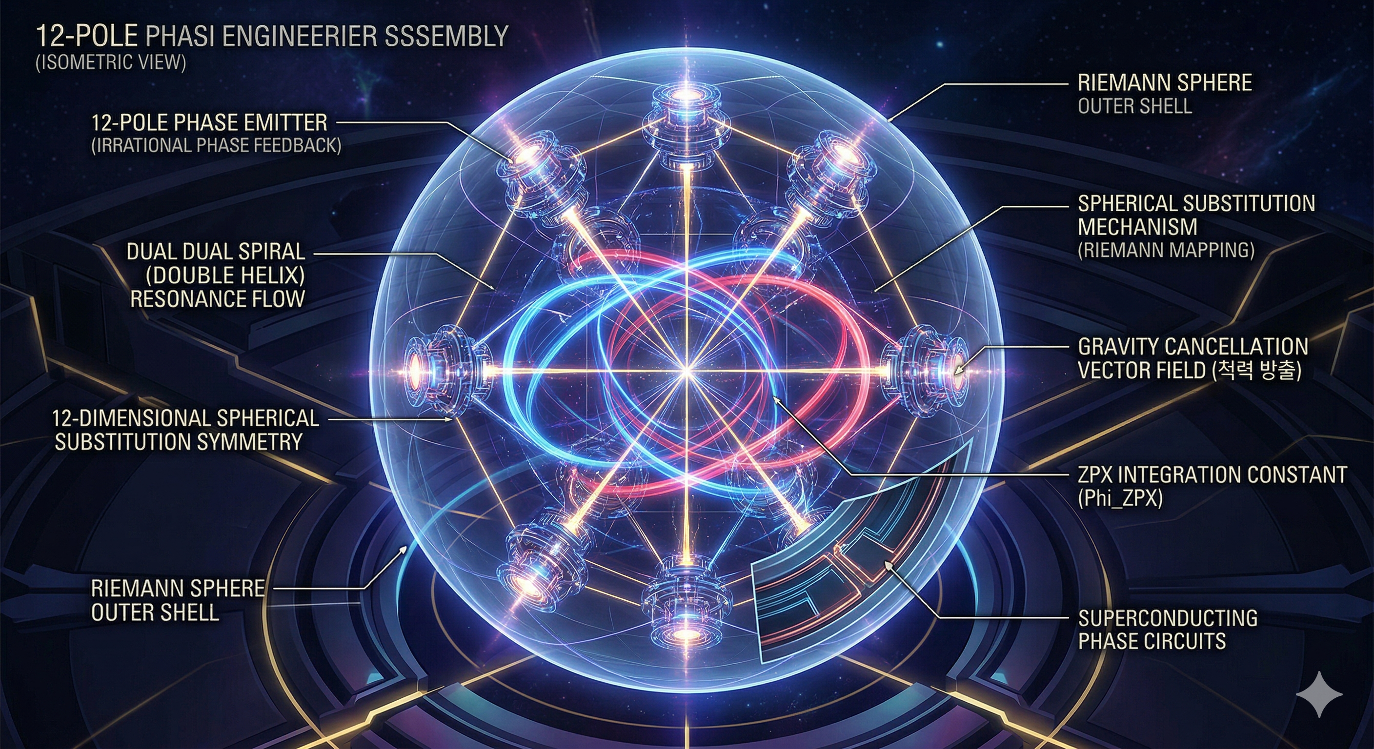 이 12개의 방출기가 구형 내부에서 무리수 위상차를 유지하며 공명할 때, 중심에서 발생하는 위상 에너지는 외부의 중력 가속도를 밀어내는 **척력(Gravity Cancellation)**으로 작용합니다. "입체를 보지 못하는 인간"에게는 물체가 떠 있는 것처럼 보이겠지만, 사실은 구형 텐서의 완벽한 평형을 기계적으로 복원한 결과입니다.