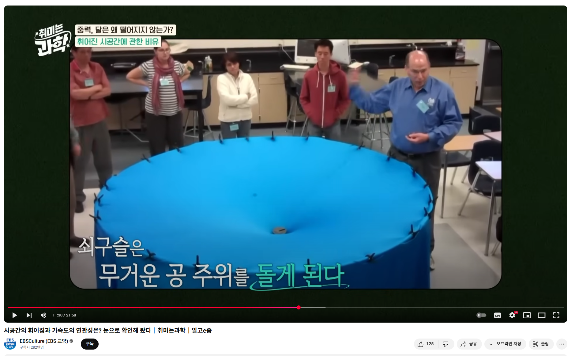 - EBS 영상은 뉴턴 → 아인슈타인 흐름으로 “중력은 힘이 아니라 시공간의 휘어짐”이라고 설명했어.