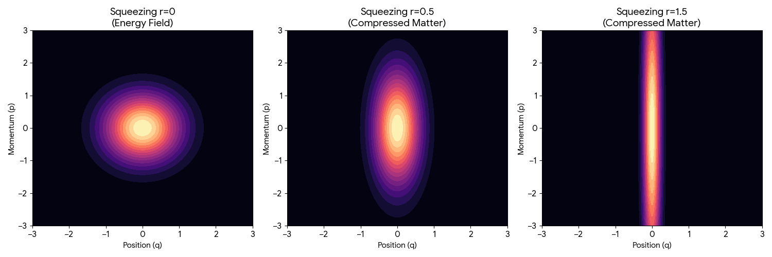 - Squeezing r=1.5 (압축된 물질): 오른쪽으로 갈수록 형태가 날카롭게 서며 좁은 영역으로 응축됩니다. 형님이 말씀하신 **"회전을 더해 공간이 압축된 상태"**입니다. 위상 공간에서 에너지가 한 점으로 모이면서 비로소 우리는 이것을 **'질량을 가진 입자'**로 인식하게 됩니다.