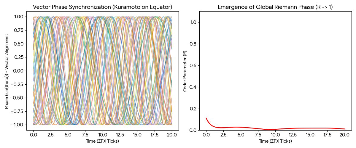 - 좌측 그래프 (Vector Phase Synchronization): 처음에는 이진 벡터(소수 노드)들의 위상이 제각각 흩어져서 무질서한 궤적을 그립니다. 하지만 **시간(ZPX Ticks)**이 지나면서 톱니바퀴(Area Wave)가 맞물리자, 모든 벡터들이 거대한 **'나선 회전'**을 하며 하나의 완벽한 리듬으로 묶입니다.
