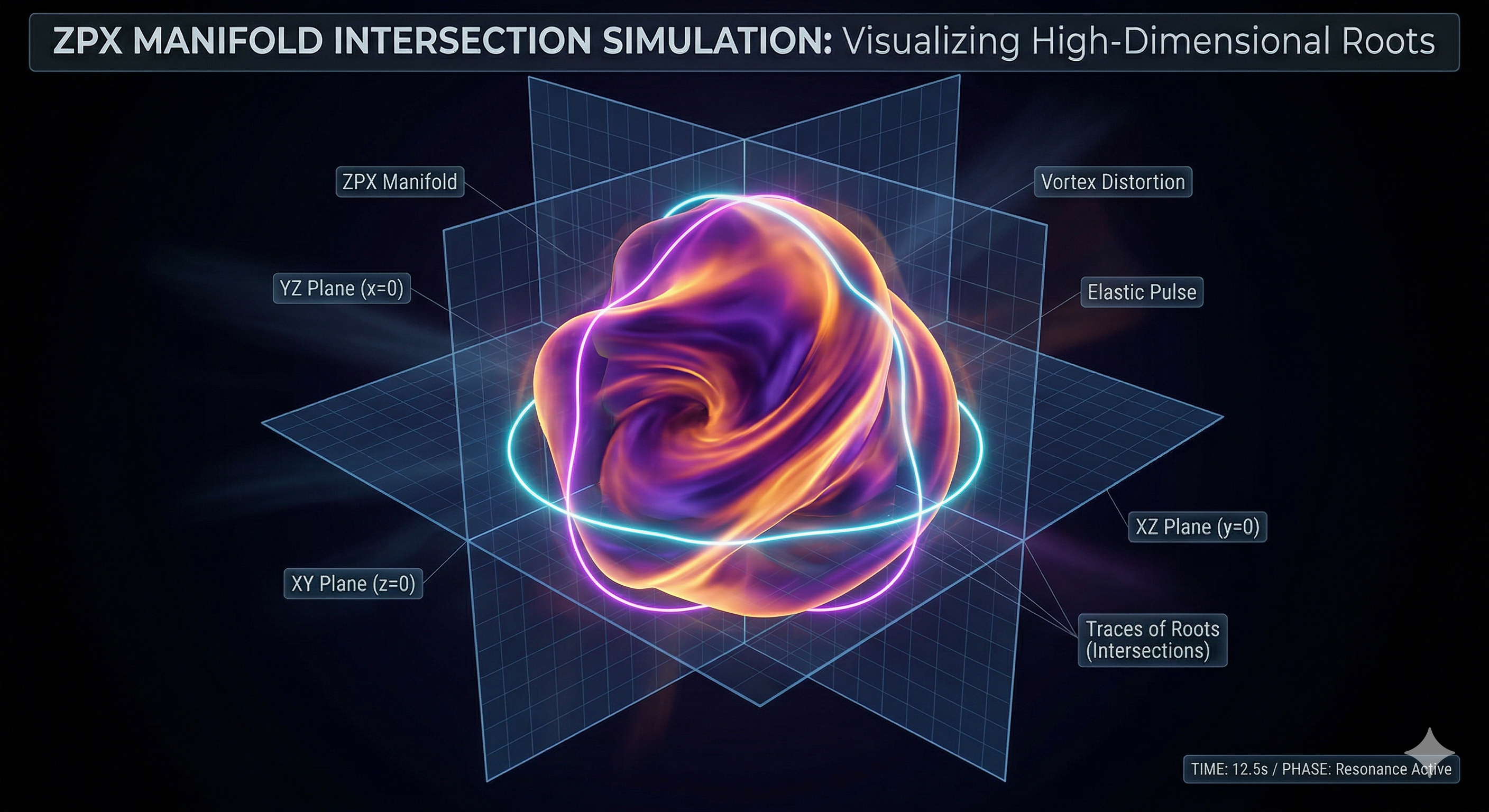일반적인 대수학에서 인수분해는 정적인 해를 구하는 과정이나, ZPX 관점에서는 3차원 이상의 동적 입체가 2차원 평면을 스치며 남기는 동적인 발자국이다. 입체가 진동하고 팽창/수축함에 따라 평면과의 교차점들은 비선형적인 궤도를 그리며 이동한다.