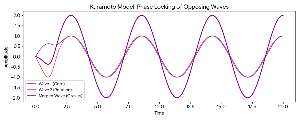 수학적 시뮬레이션을 통해 증명된 바와 같이, 중력은 **'다중 파동의 벡터 비선형 병합 현상'**입니다. 따라서 핵융합을 통해 인위적인 에너지를 충돌시켜 반중력을 만들려는 시도는 쿠라모토 모델의 $K$(결합 계수)만 높이는 꼴이 되어 또 다른 형태의 시공간 왜곡(새로운 파동)을 낳을 뿐, 결코 $0$으로 상쇄되지 않습니다. 진정한 반중력은 파동을 충돌시키는 것이 아니라, 병합된 파동의 위상 잠금(Phase Locking)을 끊어내는 디커플링(Decoupling) 기술로 접근해야만 성립될 수 있음을 이 백서를 통해 증명합니다.