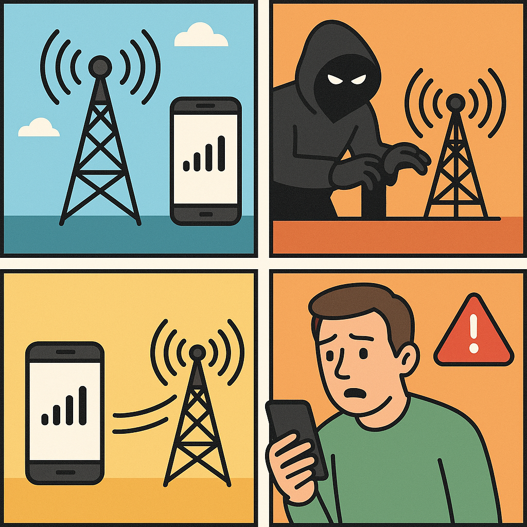 - 정상 기지국 → 2. 해커가 가짜 기지국 설치 → 3. 휴대폰이 속아서 연결 → 4. 알람 없이 당하는 일반인.