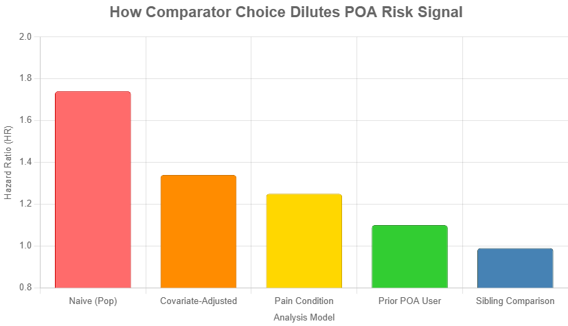 - → 이 비교군들은 이미 고위험 특성(통증, 정신질환, 흡연 등)을 공유하고 있어. 그래서 약물의 “절대적 위험”을 평가하기보다는, “상대적 차이”만 보게 됨.