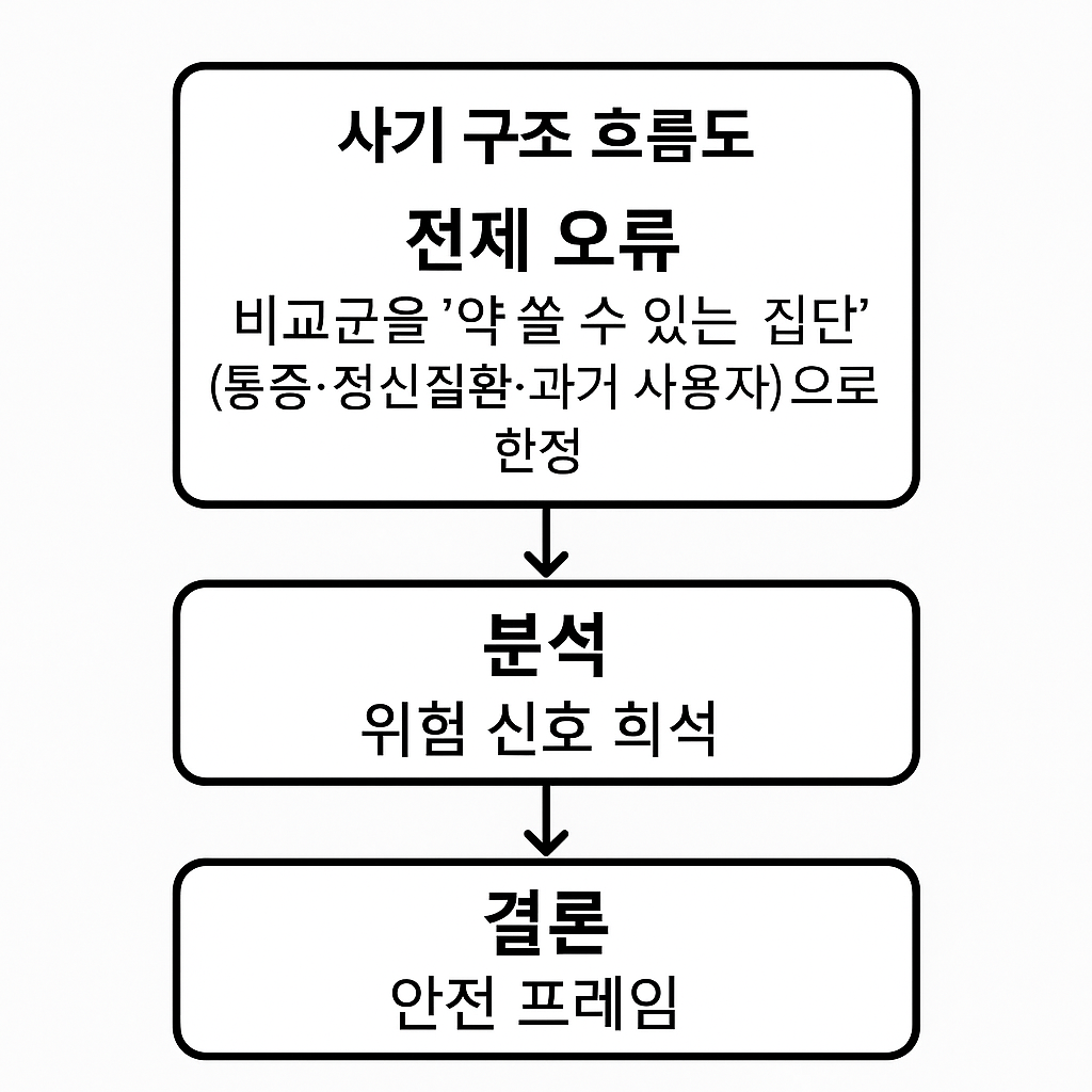 - 그런데 비교군을 **‘약 쓸 수 있는 집단(통증·정신질환·과거 사용자)’**으로 한정.