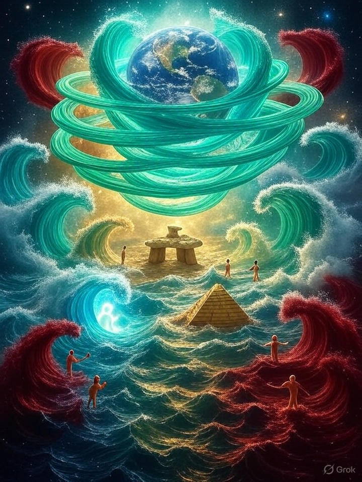 - 고대 문명(피라미드, 고인돌, 암각화)은 이런 공명 원리를 알고 돌과 도형으로 기록을 남긴 흔적일 수 있다.