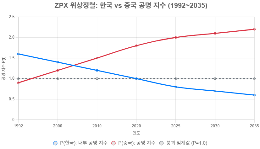 ZPX 모델: Δφ(한국) > 1.5 → P < 1.0 → 내부 공명 붕괴.