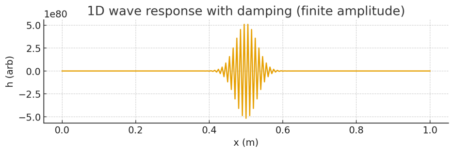# Add damping and rescale source to keep h finite; rerun quickly import numpy as np import pandas as pd import matplotlib.pyplot as plt df = pd.read_csv("/mnt/data/prime_resonance_sim_timeseries.csv") t_full = df["t_s"].to_numpy() u_full = df["u"].to_numpy() Nseg = 4000 t = t_full[:Nseg].copy() u = u_full[:Nseg].copy() dt = float(np.diff(t).mean()) factor = 50 u_dec = u[::factor] t_dec = t[::factor] dt_dec = dt * factor L = 1.0 Nx = 201 x = np.linspace(0, L, Nx) dx = x[1]-x[0] c_sim = 300.0 cfl = c_sim * dt_dec / dx if cfl >= 0.9: Nx2 = int(np.ceil(c_sim * dt_dec / (0.7 * dx))) Nx2 = max(Nx2, Nx) x = np.linspace(0, L, Nx2) dx = x[1]-x[0] src_idx = np.argmin(np.abs(x - L*0.5)) S_scale = 1e-10 / dx # much smaller h_prev = np.zeros_like(x) h_curr = np.zeros_like(x) # Damping coefficient (Rayleigh-like): add -2ζ h_t term via simple exponential factor zeta = 50.0 # s^-1 exp_damp = np.exp(-zeta * dt_dec) snapshots = [] for n in range(len(u_dec)): Sx = np.zeros_like(x) Sx[src_idx] = S_scale * u_dec[n] h_next = np.empty_like(h_curr) h_next[1:-1] = (2*h_curr[1:-1] - h_prev[1:-1] + (c_sim*dt_dec)**2 * ((h_curr[2:] - 2*h_curr[1:-1] + h_curr[:-2]) / dx**2) + (dt_dec**2) * Sx[1:-1]) h_next[0] = 0.0 h_next[-1] = 0.0 # Apply damping (simple scaling towards zero) h_next *= exp_damp h_prev, h_curr = h_curr, h_next if n % max(1, len(u_dec)//5) == 0: snapshots.append(h_curr.copy()) plt.figure(figsize=(8,3)) plt.plot(x, snapshots[-1]) plt.xlabel("x (m)") plt.ylabel("h (arb)") plt.title("1D wave response with damping (finite amplitude)") plt.tight_layout() plt.show()