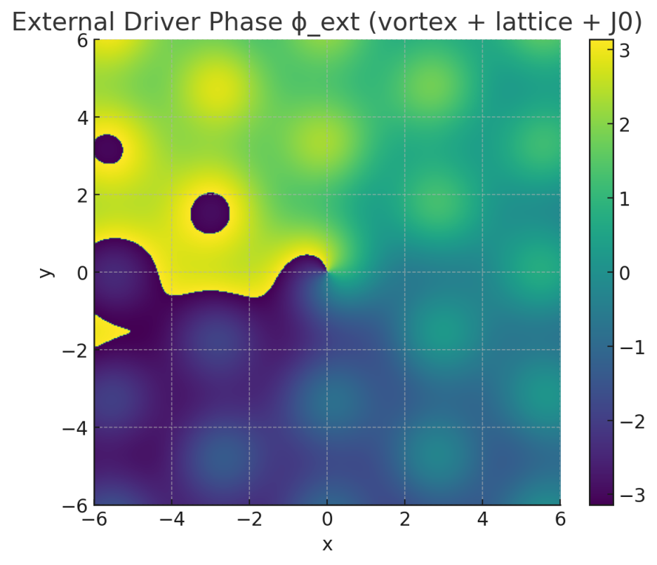 # Re-run deliverables generation carefully in stages. import numpy as np import matplotlib.pyplot as plt from matplotlib.animation import FFMpegWriter from scipy.ndimage import laplace as nd_laplace from scipy.special import j0 import pandas as pd import os base = "/mnt/data" os.makedirs(base, exist_ok=True) # ---------- Stage A: Build base 2D fields ---------- def build_grid_2d(L=6.0, N=240): x = np.linspace(-L, L, N) y = np.linspace(-L, L, N) X, Y = np.meshgrid(x, y) R = np.sqrt(X**2 + Y**2) TH = np.arctan2(Y, X) return x, y, X, Y, R, TH def composite_driver_2d(X, Y, R, TH, l=1, k_r=1.6, period=2.8): phi_vortex = l * TH bessel = j0(k_r*R) k = 2*np.pi/period waves = (np.cos(k*X) + np.cos(k*(-0.5*X + (np.sqrt(3)/2)*Y)) + np.cos(k*(-0.5*X - (np.sqrt(3)/2)*Y))) phi_ext = np.angle(np.exp(1j*(phi_vortex + 0.45*bessel + 0.25*waves))) env = np.exp(-R**2/9.0) return phi_ext, env def evolve_theta_2d(phi_ext, x, steps=220, K=0.6, H=1.2, omega_scale=0.10, seed=3): rng = np.random.default_rng(seed) theta = rng.uniform(-np.pi, np.pi, size=phi_ext.shape) omega = omega_scale * rng.normal(size=phi_ext.shape) dx = x[1]-x[0] dt = 0.03 for _ in range(steps): lap = nd_laplace(theta) / (dx**2) theta += dt*(omega + K*lap + H*np.sin(phi_ext - theta)) theta = np.angle(np.exp(1j*theta)) return theta def resonance(theta, phi_ext): return np.cos(theta - phi_ext) + 1.0 x, y, X, Y, R, TH = build_grid_2d() phi_ext, env = composite_driver_2d(X, Y, R, TH) theta = evolve_theta_2d(phi_ext, x) P_base = resonance(theta, phi_ext) Pnorm = P_base - 1.0 np.save(os.path.join(base, "phi_ext_base.npy"), phi_ext) np.save(os.path.join(base, "P_base.npy"), P_base) # ---------- Stage B: Δt sweep MP4s ---------- omega0 = 2.0 alpha = 0.7 dt_vals = np.linspace(-1.0, 1.0, 41) dt_grad = 0.15*np.tanh((R-2.5)/1.0) def fields_for_dt(dt_scalar): dt_map = dt_scalar + dt_grad S_map = 0.5*(1.0 + np.cos(omega0*dt_map)) omega_eff = omega0 * (1.0 - alpha*np.clip(Pnorm, -1, 1)) * (0.5 + 0.5*S_map) omega_eff = np.clip(omega_eff, 0.05, None) m_eff = omega_eff G = 1.0; M0 = 1.0; eps = 0.4 r = np.sqrt(R**2 + eps**2) Phi0 = -G*M0 / r scale = m_eff / m_eff.mean() Phi_mod = -G*M0*scale / r Phi_diff = Phi_mod - Phi0 return S_map, P_base, m_eff, Phi_diff def make_mp4(name, field_fn, vmin=None, vmax=None): path = os.path.join(base, name) fig = plt.figure(figsize=(6,5)) ax = plt.gca() im = ax.imshow(field_fn(dt_vals[0]), extent=[x.min(), x.max(), y.min(), y.max()], origin='lower', vmin=vmin, vmax=vmax) ax.set_title(f"{name} Δt={dt_vals[0]:.2f}") ax.set_xlabel("x"); ax.set_ylabel("y") plt.colorbar(im) writer = FFMpegWriter(fps=10, bitrate=1500) with writer.saving(fig, path, dpi=150): for dt_scalar in dt_vals: arr = field_fn(dt_scalar) im.set_data(arr) ax.set_title(f"{name} Δt={dt_scalar:.2f}") writer.grab_frame() plt.close(fig) return path S0, P0, m0, Ph0 = fields_for_dt(0.0) paths = [] paths.append(make_mp4("zpx_S_timesweep.mp4", lambda d: fields_for_dt(d)[0], vmin=0.0, vmax=1.0)) paths.append(make_mp4("zpx_P_timesweep.mp4", lambda d: fields_for_dt(d)[1], vmin=0.0, vmax=2.0)) paths.append(make_mp4("zpx_meff_timesweep.mp4", lambda d: fields_for_dt(d)[2], vmin=m0.min(), vmax=m0.max())) paths.append(make_mp4("zpx_PhiDiff_timesweep.mp4", lambda d: fields_for_dt(d)[3], vmin=Ph0.min(), vmax=Ph0.max())) print("MP4s:", paths) # ---------- Stage C: Materials parameter table ---------- materials = [ ("Si", "semiconductor", 8.5, 0.6, 0.03, "bandgap modulation near phonon modes"), ("GaAs", "semiconductor", 4.2, 0.8, 0.05, "high mobility; strong EM coupling"), ("Graphene", "semimetal", 30.0, 0.5, 0.02, "Dirac cones; plasmon support"), ("Fe", "spin", 0.12, 0.95, 0.002, "ferromagnetic; strong spin alignment"), ("YIG", "magnon", 0.005, 0.98, 0.0005, "low damping spin waves"), ("Nb", "superconductor", 0.7, 0.7, 0.01, "pairing-sensitive; cavity-friendly"), ("AlN", "phonon", 12.0, 0.4, 0.10, "strong optical phonon"), ("SiC", "phonon-polariton", 24.0, 0.55, 0.07, "reststrahlen band support"), ] df = pd.DataFrame(materials, columns=[ "material", "class", "f_res (THz)", "Δφ sensitivity (0..1)", "Δt stable (±)", "primary effect" ]) def g_fr(f): return 1.0 / (1.0 + (f/25.0)**2) scores = [] for _, row in df.iterrows(): score = row["Δφ sensitivity (0..1)"] * (row["Δt stable (±)"]/0.1) * g_fr(row["f_res (THz)"]) scores.append(score) df["resonance score (0..1)"] = np.clip(scores, 0, 1) csv_path = os.path.join(base, "zpx_material_thresholds.csv") df.to_csv(csv_path, index=False) from caas_jupyter_tools import display_dataframe_to_user display_dataframe_to_user("ZPX Materials Thresholds", df) # ---------- Stage D: 3D cavity expansions (slices only, separate figures) ---------- def build_grid_3d(L=5.0, N=56): x = np.linspace(-L, L, N) y = np.linspace(-L, L, N) z = np.linspace(-L, L, N) X, Y, Z = np.meshgrid(x, y, z, indexing='ij') return x, y, z, X, Y, Z def phase_driver_spherical(X, Y, Z, l=2, m=1, k_r=1.0): R = np.sqrt(X**2 + Y**2 + Z**2) + 1e-8 TH = np.arccos(np.clip(Z/R, -1, 1)) PH = np.arctan2(Y, X) phase = m*PH + l*TH + 0.3*j0(k_r*R) return np.angle(np.exp(1j*phase)) def phase_driver_cylindrical(X, Y, Z, l=2, kz=0.8, kr=1.2): R = np.sqrt(X**2 + Y**2) PH = np.arctan2(Y, X) phase = l*PH + 0.4*np.cos(kz*Z) + 0.3*j0(kr*R) return np.angle(np.exp(1j*phase)) def phase_driver_toroidal(X, Y, Z, R0=2.2, l=2): Rxy = np.sqrt(X**2 + Y**2) + 1e-8 phi = np.arctan2(Y, X) u = np.arctan2(Z, Rxy - R0) # poloidal angle phase = l*(phi + u) + 0.2*np.cos(3*u) return np.angle(np.exp(1j*phase)) def relax_phase_3d(phi_ext, steps=50, K=0.5, H=1.0, omega_scale=0.05, seed=1): rng = np.random.default_rng(seed) theta = rng.uniform(-np.pi, np.pi, size=phi_ext.shape) omega = omega_scale * rng.normal(size=phi_ext.shape) dt = 0.02 for _ in range(steps): lap = (np.roll(theta,1,0) + np.roll(theta,-1,0) + np.roll(theta,1,1) + np.roll(theta,-1,1) + np.roll(theta,1,2) + np.roll(theta,-1,2) - 6*theta) theta += dt*(omega + 0.5*lap + H*np.sin(phi_ext - theta)) theta = np.angle(np.exp(1j*theta)) return theta def sav