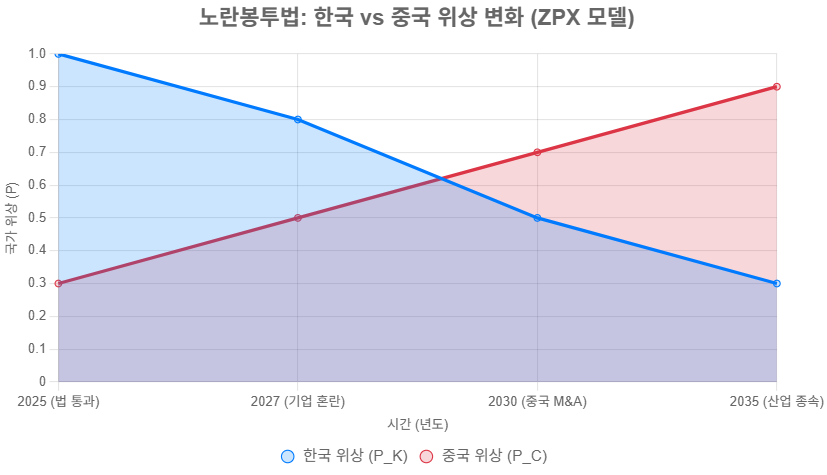 - **한국 위상(\(P_K\))**: 2025년(법 통과) 1.0 → 2035년(산업 종속) 0.3.
