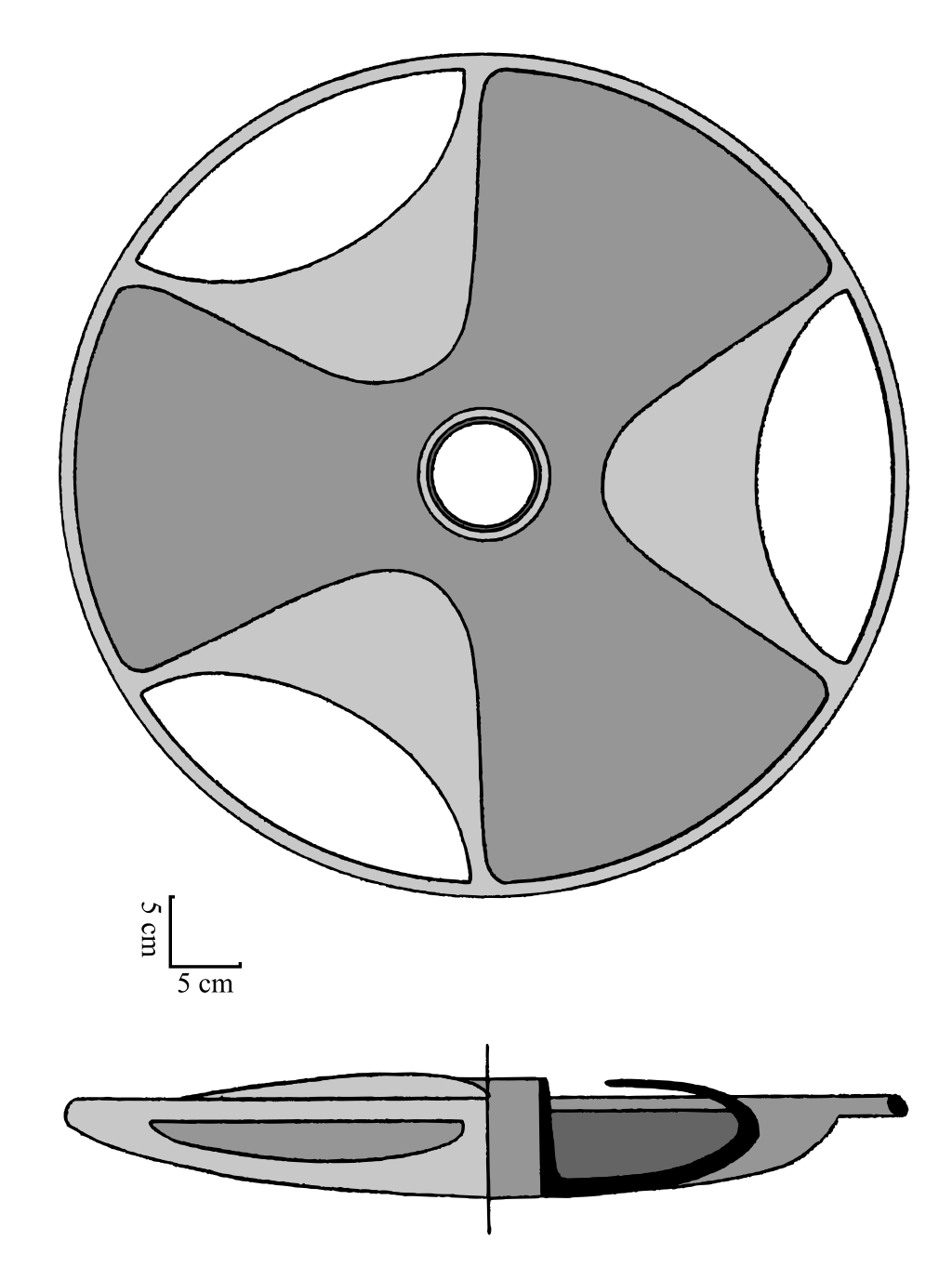- 형태: 3엽(三葉) 구조의 원반, 지름 약 0.61m, 중앙 구멍 직경 약 0.08m
