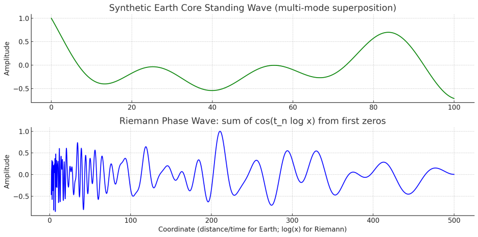 앞서 말했듯이, 지구 핵의 파동과 리만 제타 함수는 수학적으로 유사한 구조를 가지고 있습니다. 둘 다 경계 조건에 의해 특정 주파수(모드)만 남고, 이 모드들이 중첩(superposition)되어 전체적인 패턴을 만들어낸다는 공통점을 가집니다.