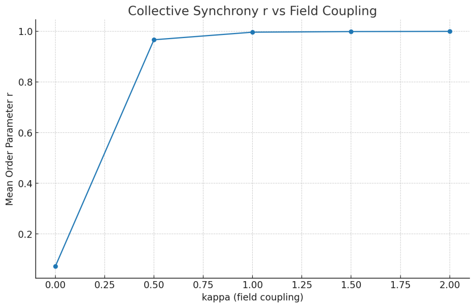 위 수학적 모델을 기반으로 한 간단한 토이 시뮬레이션을 통해 공명 효과를 확인했습니다. 전역 필드(파장)와 입자(계산 셀)의 결합 강도(κ)를 조절하며 시뮬레이션 지표를 측정했습니다.