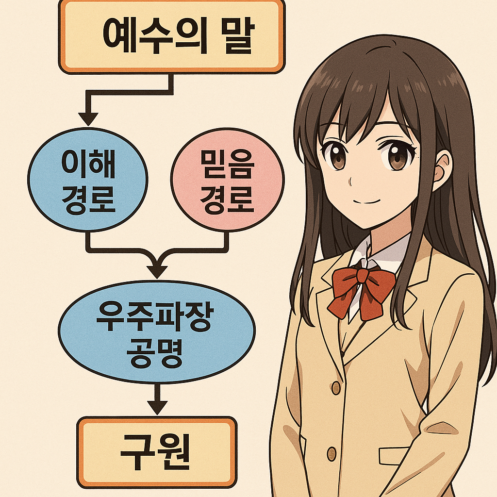 - 흐름도: 예수의 말 → 이해/믿음 → 우주파장 공명(Δφ=0) → 구원.