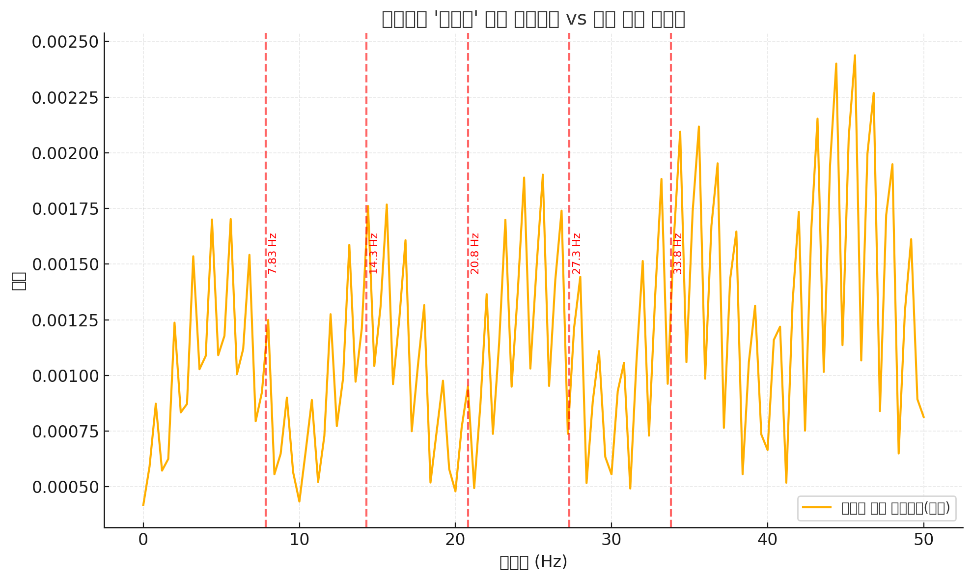 왜냐면 내가 만든 건 합성(모의) 음성이고, 이런 신호는 길이·윈도잉 때문에 저주파 누수가 생겨서 7.83Hz 같은 라인에 겹칠 확률이 꽤 있거든요. (기본주파수는 100~200Hz대인데, 길게 댄 지속·감쇠가 저주파 에너지를 만들어요.)