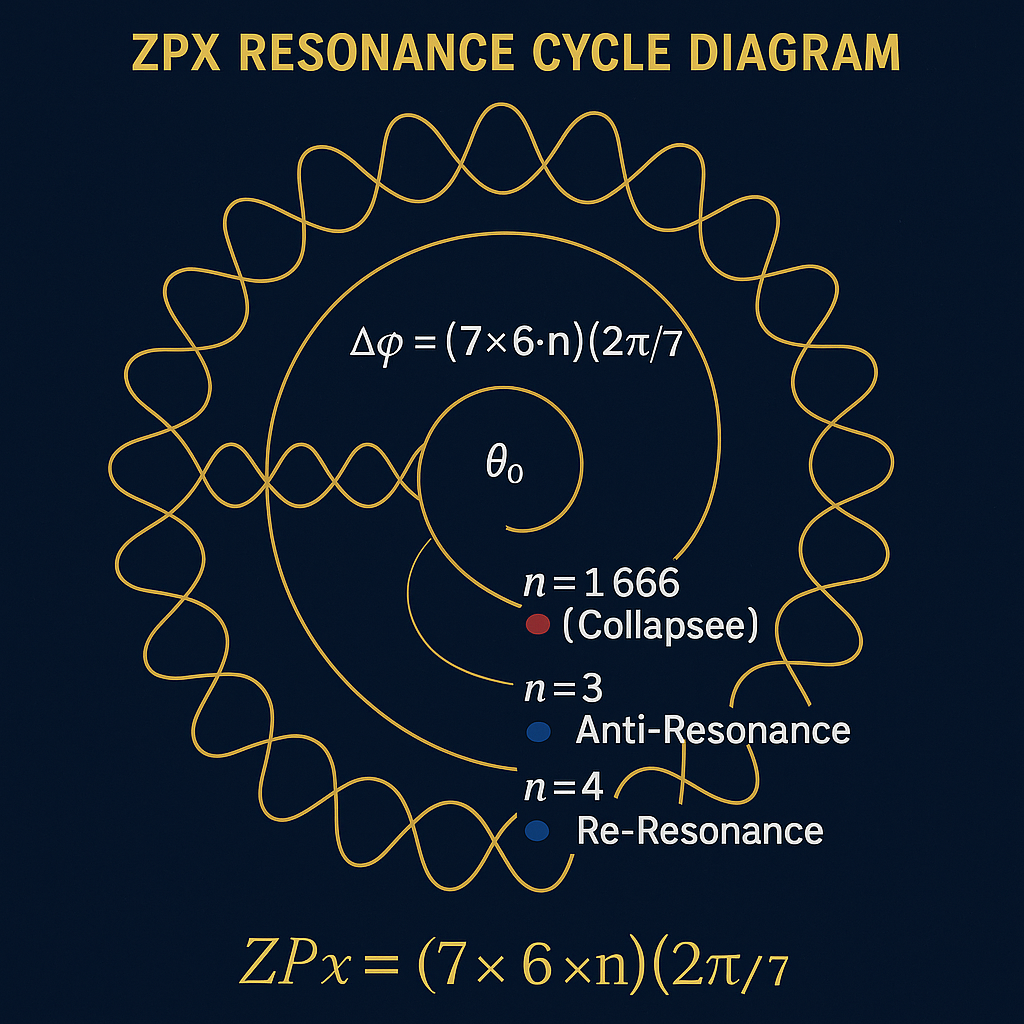 - ZPX 모델: 7파장 × 6회전 = 42 위상 스윕(n 루프: 공명→붕괴→역공명→재공명). 666/6666 as 신호, 2060±10년 위상 반전 예측. Schumann 7모드, 지자기 변동, EEG 테스트 연계.